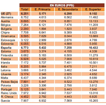 Según los últimos datos disponibles a nivel europeo, de 2007, el gasto por alumno en la UE-27 era de 6.251 euros de media al año. España superaba ampliamente esa cifra, con 6.773 euros. Alemania o Finlandia, dos países mucho más ricos y con resultados sensiblemente superiores en PISA, gastaban 6.752 y 6,682 euros respectivamente. Y Estonia, el país del este más exitoso en el examen de la OCDE, apenas llegaba a los 3.675 euros (aunque los utilizaba mejor que España).