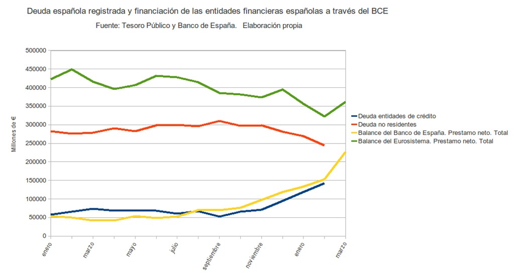 Aunque aún no disponemos de datos de tenedores de deuda española por tipo de inversor de marzo, es de suponer que las ventas de deuda por parte de los inversores extranjeros tienen que haber sido masivas y que, aun con esta enorme cantidad de liquidez obtenida en el BCE, han superado la capacidad de compra de la banca española. Luego, el problema real es que, por alguna razón, los inversores extranjeros han empezado a "vender España", algo que parece estar ocurriendo también en la Bolsa española.
