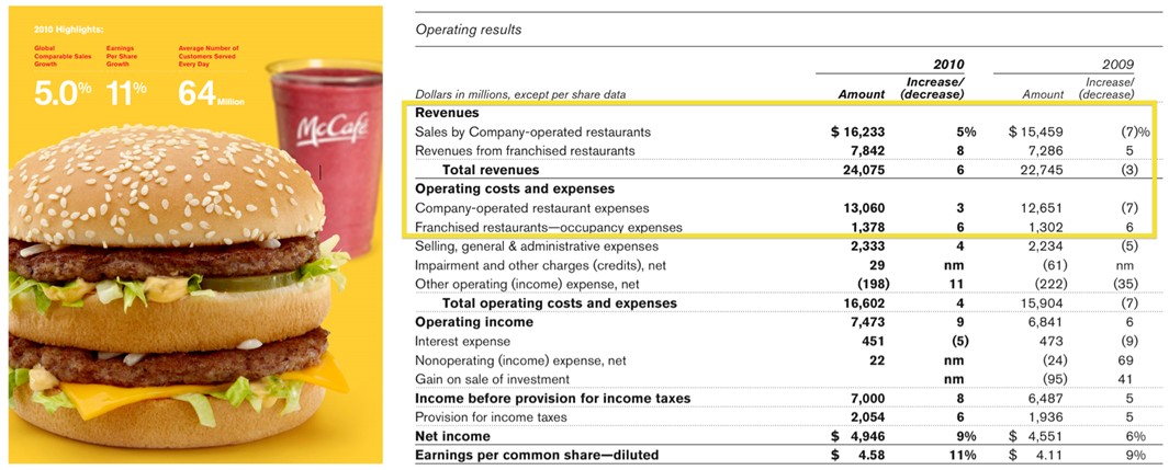 En este caso, no aparece expresamente el importe del Margen Bruto, pero basta con restar a la cifra de ingresos (Total Revenues) tanto los costes de producción de las establecimientos propios (Company-operated restaurants) como los costes que le generan los establecimientos franquiciados (Franchised restaurants – occupancy expenses) para obtener el importe que buscamos. Así, en 2010, el % Margen Bruto se sitúa en el 60% (14.438/24.075 = 0,60). En 2009 era el 61% (13.953/22.745 = 0,61). En fin, al igual que el caso de Coca-Cola, una excelente empresa con excelentes números.