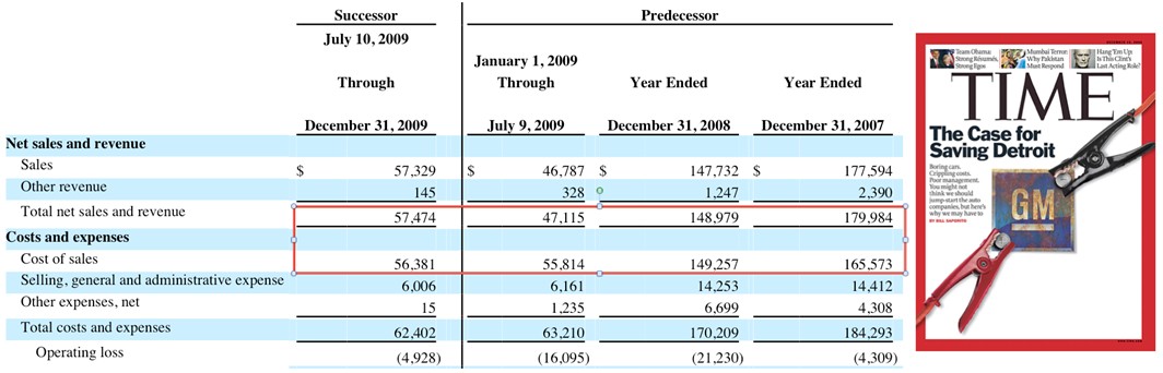 El 2009 es el año de las turbulencias. Si observan la tabla anterior verán que la cuenta de resultados de 2009 se divide en dos sub-períodos: pre y post bancarrota (9 de julio). De nuevo, la suma de las ventas de los dos sub-períodos es inferior al coste de esas ventas.