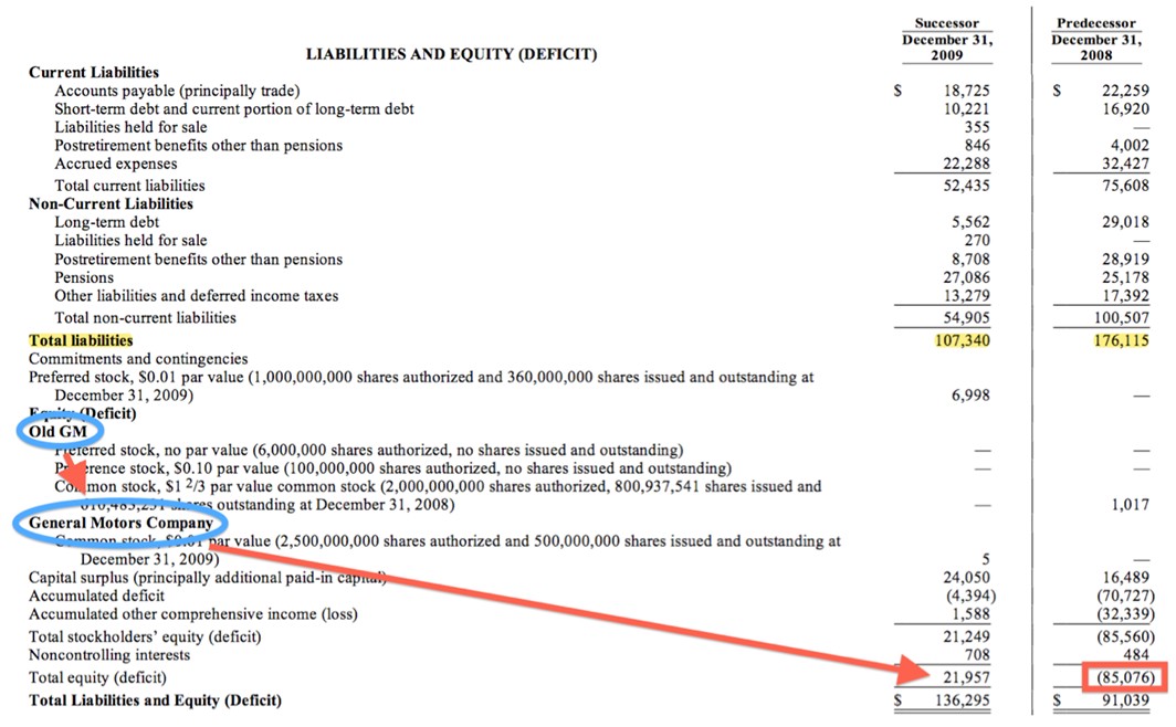 - La cifra destacada en rojo se corresponde con el Patrimonio Neto de la empresa a fecha 31 de diciembre de 2008. Como está entre paréntesis, ya sabemos que se trata de una muy mala noticia: quiebra contable. ¿Y cómo está de lejos la empresa de cumplir la exigencias de sus acreedores? Agárrense: a más de 85.000 millones de dólares. O para que ustedes me entiendan: una cifra equivalente al déficit público estimado por el Gobierno español para 2011.