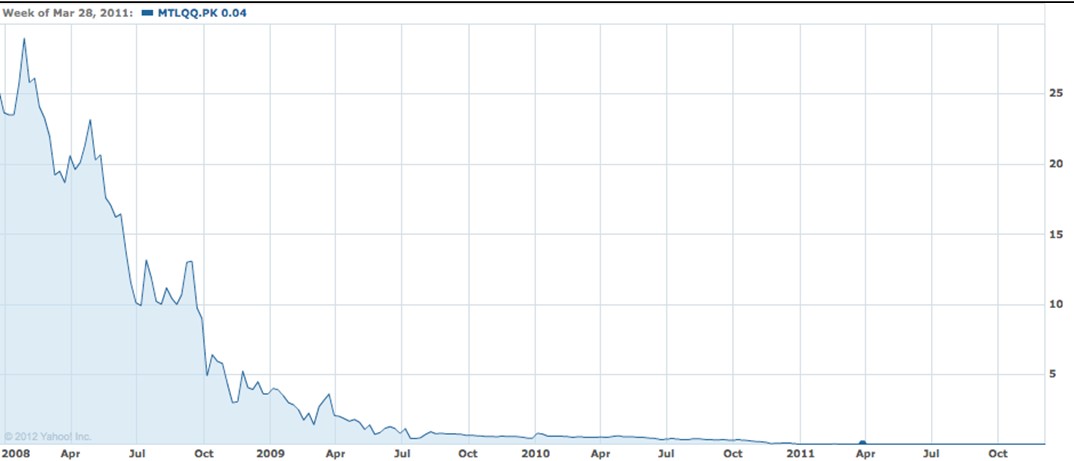 En aquella primera semana de febrero de 2008, las acciones del gigante del sector del automóvil se movían en torno a esos 25 dólares. Desde la última semana de marzo de este año, esas mismas acciones valen 7 céntimos. Y no, no me equivoco: 7 céntimos.