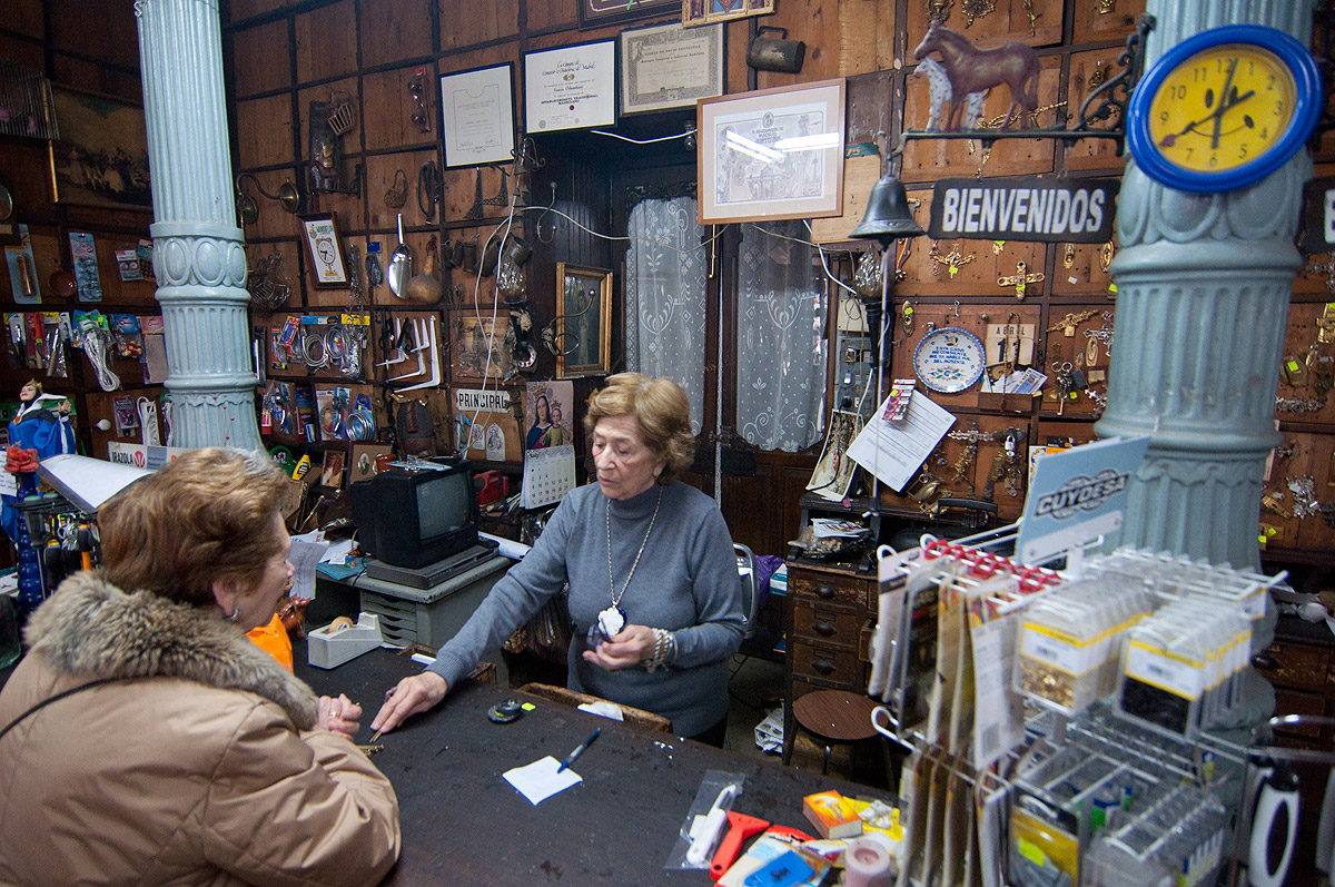 Se trata de un establecimiento que lleva desde 1888 en el mismo local de la calle Atocha, justo al lado del Teatro Monumental. María Jesús, que sigue allí porque "yo quiero mucho a esta tienda" se lamenta de que las autoridades ayudan poco a los comerciantes y de que su calle, hace tiempo de las más comerciales de Madrid, es ahora "un desastre".