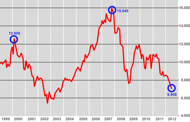Desde que se creara el principal índice bursátil español, el 12 de enero de 1992, ha sufrido numerosos batacazos. A finales de 1997, alcanzó por primera vez los 7.000 puntos que ahora ha perdido. Esto quiere decir que la bolsa española está en el mismo nivel que hace quince años. Nunca en la serie histórica sucedió una cosa así.