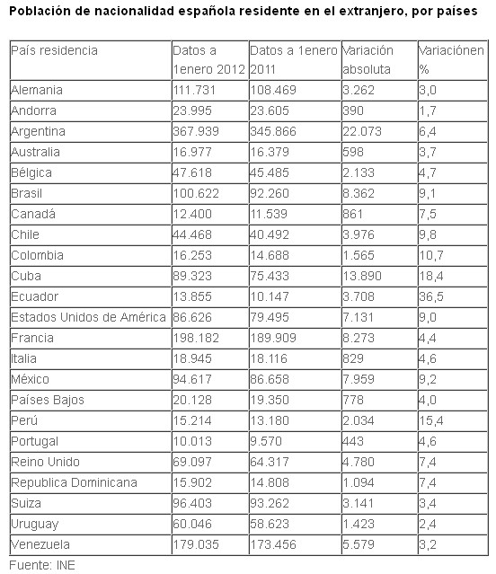 La población empadronada en España se situó en 47.212.990 personas a 1 de enero de 2012, apenas un aumento del 0,05% interanual, el más bajo de la serie, según el Instituto Nacional de Estadística (INE). Sin embargo, este leve incremento poblacional esconde un fenómeno mucho más relevante: España vuelve a ser un país de emigrantes. Es decir, se van más personas (emigrantes) de las que llegan (inmigrantes), lo cual se traduce en lo que se conoce técnicamente como "saldo migratorio negativo".