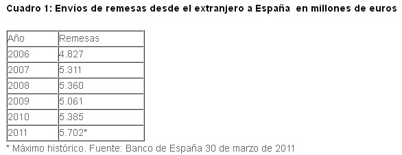 Por el momento, esta salida de españoles al extranjero en busca de trabajo ya se está manifestando en un aumento de las remesas. Los españoles que trabajan fuera del país envían parte de lo que ganan a sus familias en España. En concreto, según los últimos datos del Banco de España, las remesas de los emigrantes españoles se situaron en 5.702 millones de euros en 2011, un 6% más que en 2010, un nuevo máximo histórico en términos absolutos. La tendencia de los últimos cinco años -exceptuando el 2009- es creciente.