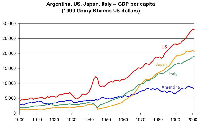 PIB per cápita de Argentina, EEUU, Japón e Italia desde 1900 al 2000
