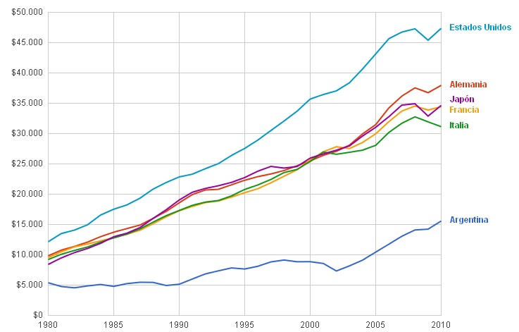 PIB per cápita de Argentina, EEUU, Alemania, Japón Francia e Italia desde 1980 a 2010
