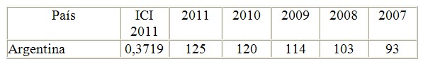 Asimismo, el Índice de Calidad Institucional (ICI) sitúa a Argentina en la posición 125 de un total de 194 países, perdiendo 32 puestos desde 2007.