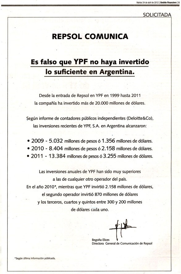 Repsol ha publicado en los principales diarios argentinos nuevos anuncios en los que informa del nivel de producción y del alcance de los hallazgos realizados por YPF y en los que califica de "falsas" algunas de las acusaciones vertidas por el Gobierno argentino.