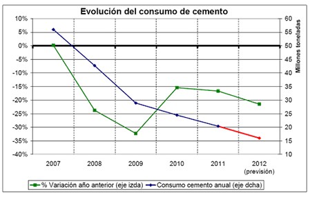 Según los datos de Oficemen (Agrupación de Fabricantes de Cemento), 2012 terminará con un consumo, "siendo optimistas", de unas 16 millones de toneladas. A los profanos, el dato puede que no les diga mucho, pero lo cierto es que es una cifra "dramática", en palabras de Juan Béjar, el presidente de la patronal. Hace apenas cinco años, en 2007, el consumo de cemento en España alcanzaba los 55 millones de toneladas.