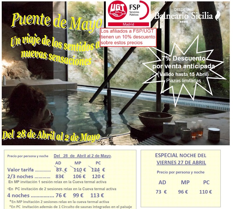 En la documentación recabada por Libertad Digital no queda lugar a dudas. Por ejemplo, vemos cómo la Federación de Servicios Públicos de UGT de Madrid tiene un folleto en el que anuncia con todo lujo de detalles y una gran foto en qué consiste un plan para pasar las vacaciones el día 1 de mayo. Se trata del Balneario Sicilia y en el texto se dan a conocer los precios y la oferta del 7% de descuento si se es militante o afiliado de la UGT.