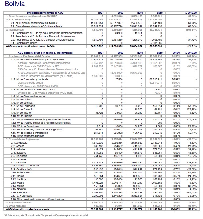 Además, según el mismo informe, en 2010, España incrementó un 56,13% las partidas destinadas a Ayuda Oficial al Desarrollo bilateral bruta a Bolivia, con 111.446.386 euros, entre lo destinado por las comunidades autónomas, entidades locales y los diferentes departamentos del Gobierno central. Aquel año, sólo la administración general del Estado dedicó 90.884.926 euros. En 2010 España destinó un total de AOD bilteral bruta de 4.769.060.436 euros.