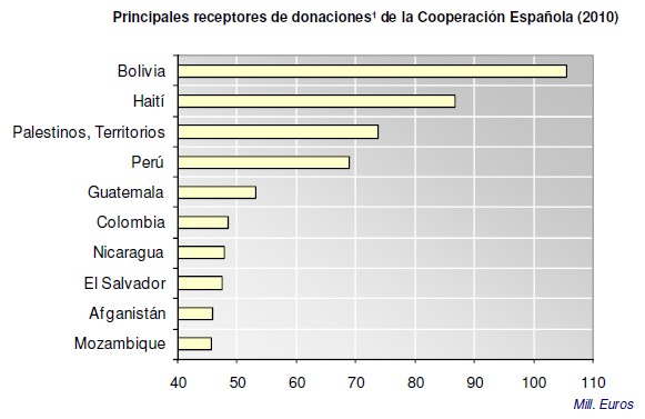 Si echamos un vistazo a los informes del Ministerio de Asuntos Exteriores y Cooperación, descubrimos que la mayor parte de las acciones en Ayuda Oficial al Desarrollo (AOD) se han realizado en las poblaciones de América del Sur, concretamente Ecuador, Bolivia y Colombia. De ellas, en 2010 Bolivia fue la principal receptora de Ayuda Oficial al Desarrollo con cerca de 110 millones de euros.