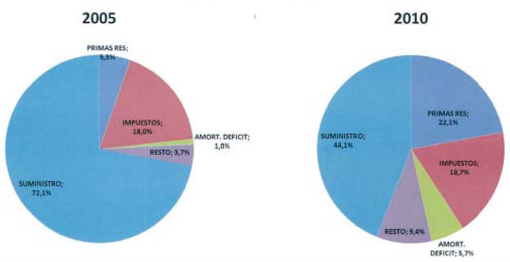 Pero claro, aproximadamente la mitad del recibo de la luz depende de otras cuestiones. Como puede verse en el siguiente gráfico, en 2010 el 22% del coste era para pagar las primas a las renovables, el 18% para pagar impuestos y un 6% para amortizar el déficit de tarifa. Todas estas partidas se han incrementado mucho en los últimos años. Según denuncia Oficemen para el cemento, el coste de los peajes de acceso se ha disparado un 125% desde 2008.