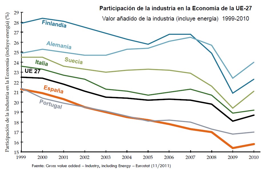 La intervención pública distorsiona los precios en una cuestión tan importante como la energía. El impacto de este hecho sobre la industria es difícil de medir. Desde 1999, la participación de la industria en la economía española ha caído del 21% al 16% en 2010. La tendencia es general en toda Europa (el sector servicios gana peso frente al industrial y al agrícola), pero en España esa tendencia se ha agudizado.