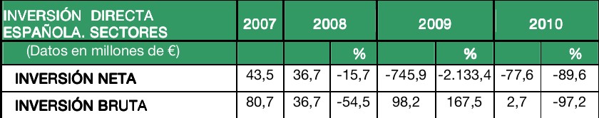 Sin embargo, la inversión bruta registra una fuerte tendencia descendente desde 2001, cuando alcanzó los 1.151,8 millones de euros. De hecho, analizando la inversión neta, en 2010 se registró, al igual que en 2009, desinversión en este país por parte del capital español