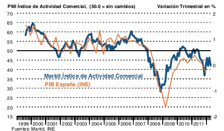 Markit destaca, además, la contracción del sector servicios en España. El Índice de Actividad Comercial ajustado estacionalmente descendió hasta los 42,1 puntos en abril frente a los 46,3 de marzo, lo cual indica que se acelera la contracción comercial en España (un indicador inferior a 50 marca recesión). La actividad en el sector ha decrecido ininterrumpidamente desde julio de 2011.