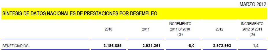 Según los datos del informe correspondiente al mes de abril, en España había en marzo de 2012 un total de 2.411.025 desempleados que no recibían prestación por desempleo. El dato corresponde al mes de marzo, y no de abril, porque los beneficiarios de prestaciones por desempleo se calculan con un mes de retraso. Esto supone 50.049 parados más sin prestación que en el mes anterior.