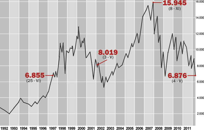 Como puede verse en el gráfico, a partir del año 97, el índice ha vivido dos grandes períodos de euforia, seguidos por dos largos desplomes. Lo extraño no es esto, puesto que es una dinámica común a todas las bolsas mundiales. Lo que se sale de lo habitual es que las bajadas hayan sido tan importantes como para contrarrestar el efecto de las subidas.