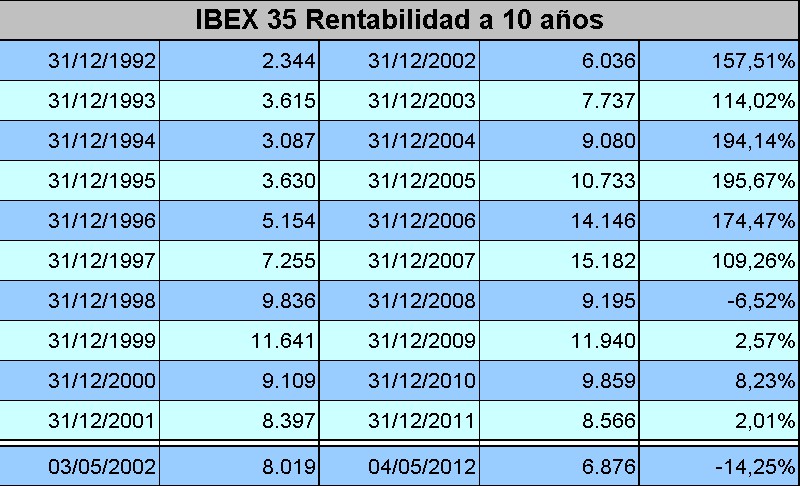 Para alguien que abriera hace diez años un fondo de inversión referenciado al Ibex, esta historia tiene pocos lados positivos. Sin embargo, los que quieran la lectura optimista pueden pensar que lo pasado, pasado está y que éste puede ser el mejor momento para comprar acciones de las empresas españolas.