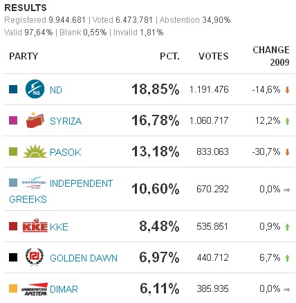 Con el 99,01% de los votos escrutados, la conservadora Nueva Democracia (ND) obtiene una pírrica victoria con el 18,88% de los votos (33,4% en 2009) y el socialdemócrata Pasok queda relegado a la tercera posición, con el 13,2% de los votos, tras ganar en 2009 con el 43,9%.
