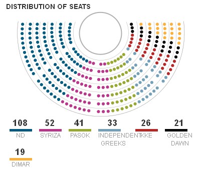 Por escaños, ND obtendría 108 (50 de ellos como premio a ser la fuerza más votada) y el Pasok 41, lo que suma 149 de un total de 300 diputados de la asamblea, insuficiente para reeditar la coalición de gobierno sólo entre ellos dos. Estos dos partidos, que fueron los que negociaron y aceptaron las condiciones del segundo rescate heleno, no suman pues la mayoría absoluta de los escaños del Parlamento precisos para gobernar, con lo que tendrían que obtener el apoyo del alguna otra formación.