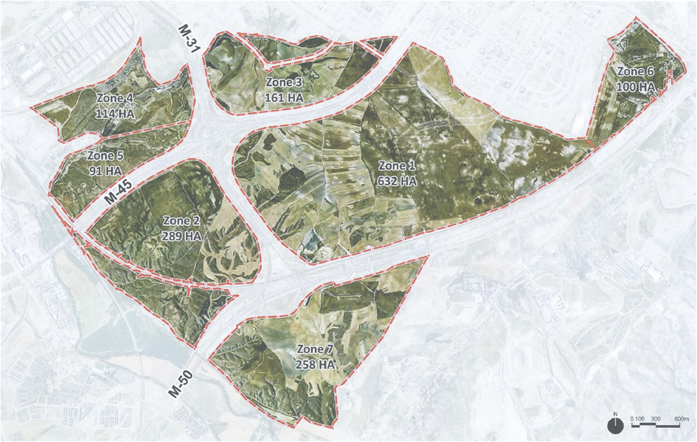Como pueden ver en el mapa, el área total está dividida en siete zonas, a su vez separadas en cinco grandes bloques por las diferentes carreteras que los cruzan, la M45 y la M50 ya citadas y también la M31. La mayor de estas zonas tiene una superficie de 632 hectáreas, en un espacio prácticamente rectangular que probablemente estaría destinado a ubicar la parte central del complejo.