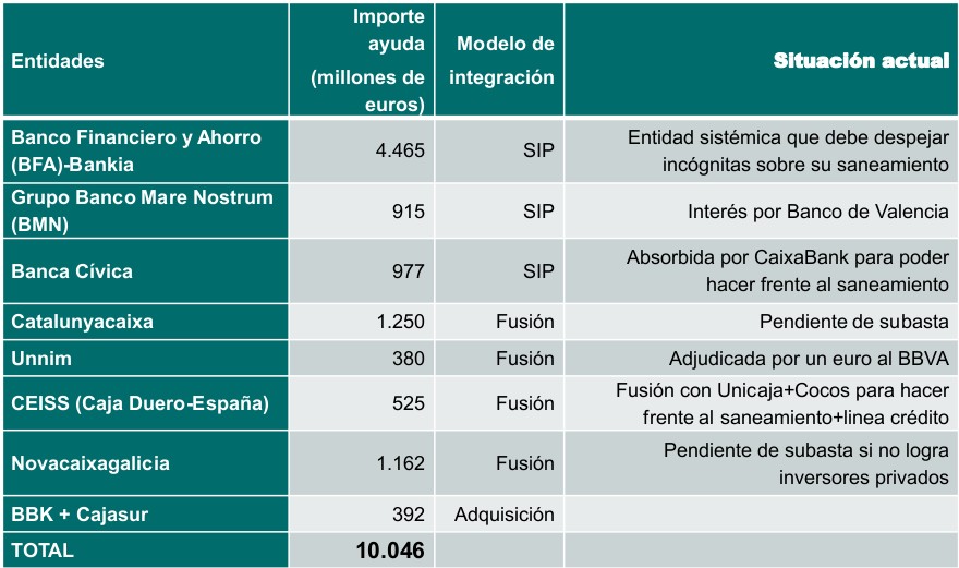 Pese a este intento, la previa fusión de cajas no solventó los problemas de solvencia -se juntaron entidades con dificultades con otras insolventes- y, de hecho, a la luz de los acontecimientos se demostró incapaz de despolitizar sus cúpulas.