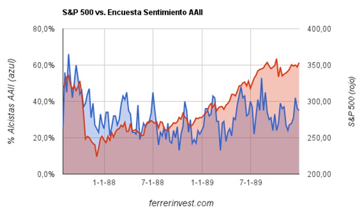 El otro día hablaba sobre las similitudes y diferencias entre la situación actual y la de 1987. Puede que el comportamiento de los precios se parezca o que incluso haya ciertas similitudes macro, pero mencioné que el sentimiento es muy distinto ahora (pesimismo) que por aquél entonces (optimismo). Éste es el gráfico del S&P 500 y de la encuesta de sentimiento de American Investors (AAII) entre 1987 y finales de 1989: