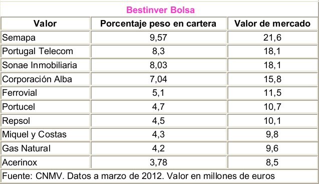Invierte el 56,2% de la cartera en acciones nacionales y el 41,7% en portuguesas, cinco puntos más que lo que tenía tres meses antes. Sus principales posiciones en el fondo son Semapa y Portugal Telecom y, según se explica en el comentario remitido a la CNMV, en el trimestre redujeron la posición en Técnicas Reunidas aprovechando la fuerte subida de la cotización y, por el contrario, aumentaron sensiblemente el peso en Portugal Telecom, hasta el 8,38%, "debido a la fuerte caída de la cotización como consecuencia del rechazo de los inversores al mercado portugués, pues los fundamentales de la compañía continúan siendo muy sólidos". También vendieron las posiciones en Arcelormittal, aprovechando subidas puntuales del valor.