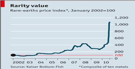 En 2010, China impuso unas cuotas a la exportación de tierras raras, limitando así el total de toneladas que se podían exportar. Esto implicó que de la noche a la mañana la oferta mundial se redujese y los precios se disparasen.