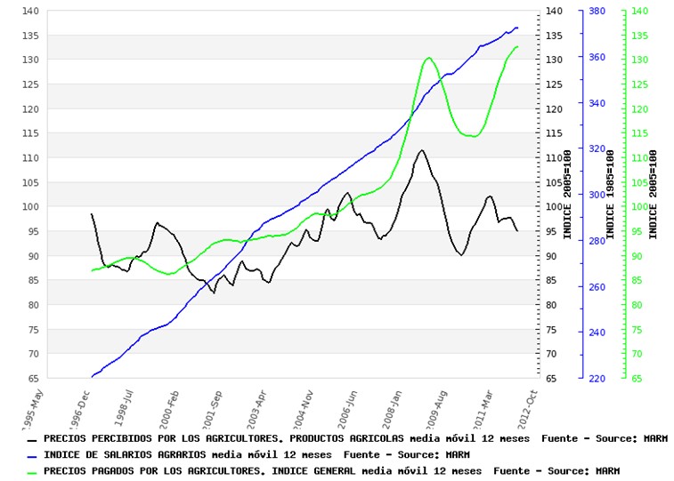 La tendencia a que los costes salariales subieran mucho más deprisa que los precios de los productos agrarios viene de lejos y como se ve en el gráfico no ha sido afectada por la crisis. Después de la entrada en el euro y hasta 2006 los precios cobrados siguieron más o menos a los costes de los agricultores. Sin embargo, y a partir de ese año, se inició una escalada de los costes que a día de hoy han subido ya un 35% mientras que los precios percibidos han bajado un 8%. Los costes salariales han seguido subiendo a un ritmo similar (+20% acumulado).