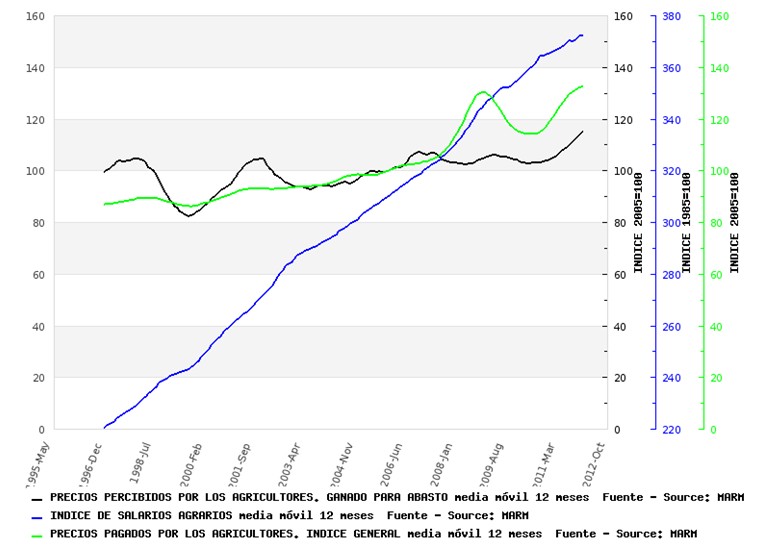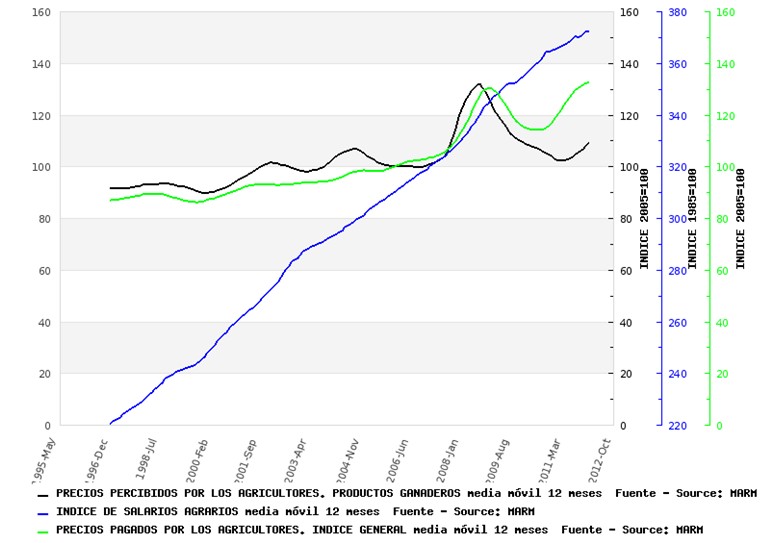 En los productos ganaderos (fundamentalmente leche y huevos) se repite la situación anterior. Los costes, excepto una vez más los salarios que casi siempre subieron más, aumentaron a la par que los precios hasta 2008, momento en que se desacoplaron. Desde entonces los precios percibidos han bajado un 14% mientras que los costes han subido un 2%. Los salarios en ese intervalo han aumentado un 6%.