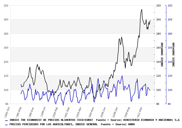La razón de este extraño desacople no es que los precios de los alimentos estén deprimidos en todo el mundo, como podemos ver en el gráfico siguiente. Desde 1996 hasta 2006 los precios internacionales y los españoles evolucionaron en paralelo, e incluso con una pequeña ventaja para los productos españoles. Sin embargo, y a partir de 2006, el desacople ha sido brutal. Los precios internacionales se han duplicado mientras que los españoles no han subido absolutamente nada.