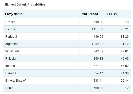Según la firma CMA Vision, este indicador refleja una probabilidad de quiebra superior ya al 38% -nuevo máximo histórico-, noveno país con mayor riesgo de impago si se excluye al estado de Illinois en EEUU si bien se sitúa por detrás de los países de la zona euro rescatados (Grecia, Irlanda y Portugal).