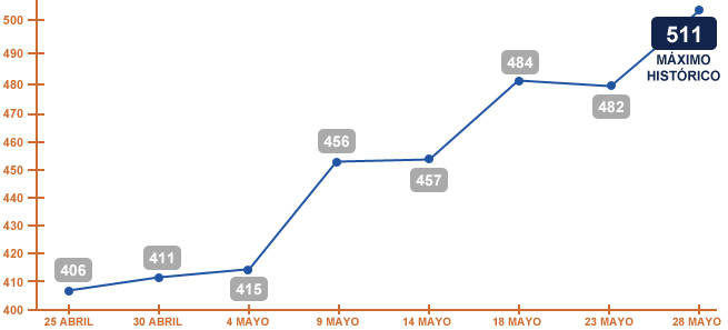 Tras superar los 500 puntos básicos poco después de las nueve de la mañana, la prima de riesgo española continuaba su tendencia alcista y a las 10:10 horas era ya 16 puntos más elevada que al cierre del viernes.