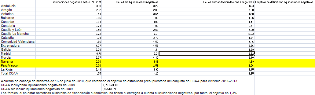 Así, contabilizando dichas liquidaciones negativas, Madrid fue la única autonomía de España que cumplió con el objetivo de déficit fijado para 2011. Y es que, incluyendo las liquidaciones, el desvío máximo permitido se estableció en el 3,3% del PIB, y sin incluirlas en el 1,3%. La cuestión clave es que Madrid cerró con un déficit del 2,92% incluyendo las liquidaciones negativas, siendo la única que cumplió con el límite marcado, superando incluso a las regiones forales, cuyo objetivo era el 1,3% por contar con un régimen de financiación propio (País Vasco cerró en el 2,56% y Navarra en el 1,89%).
