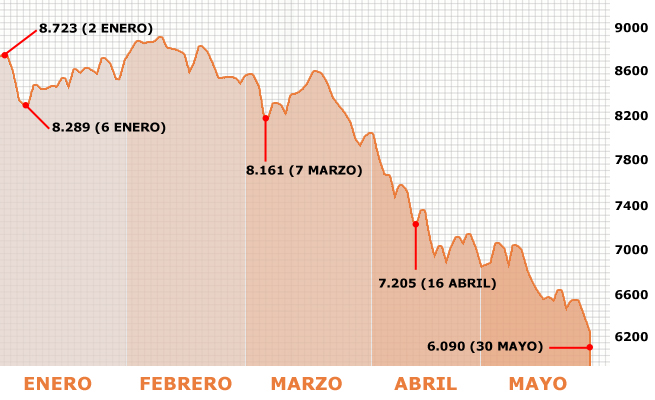 Tan sólo tres valores del Ibex se han salvado de los números rojos esta sesión. Gas Natural ganaba un 2,31%, Caixabank un 0,83% y R.E.C un 0,65%. Sacyr, por su parte, ha liderado las pérdidas de la jornada con una caída del 11,18% seguido de Bankia que se ha dejado un 8,60%. En lo que va de año, el selectivo se ha dejado un 28,9%.