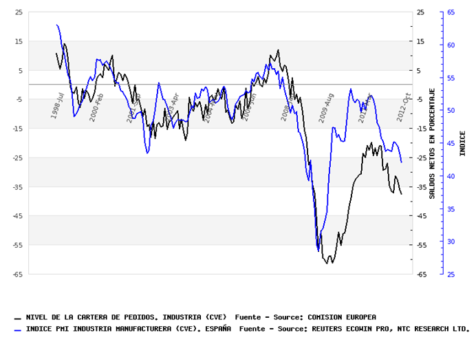 Empezando por la industria, el nivel de la cartera de pedidos se desplomó hasta mínimos desde abril de 2010, mientras que el índice PMI de manufacturas marca mínimos desde mayo de 2009. Este último indicador se elabora en multitud de países, y España ha tenido el dudoso honor de ocupar el farolillo rojo entre todos ellos (seguida muy de cerca por Australia y Grecia). La industria lleva contrayéndose ininterrumpidamente desde hace 13 meses.