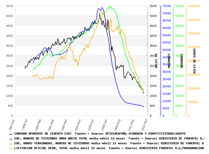 La construcción sigue en una espiral descendente que hubiera resultado totalmente impensable hace pocos años, cuando las grúas invadían el paisaje y las hormigoneras las carreteras. El consumo de cemento de abril (último dato publicado) se quedó en 1,12 millones de Tm, siendo el menor consumo para un mes de abril desde hace 46 años. El descenso desde el mejor abril (2006) es del 76%.