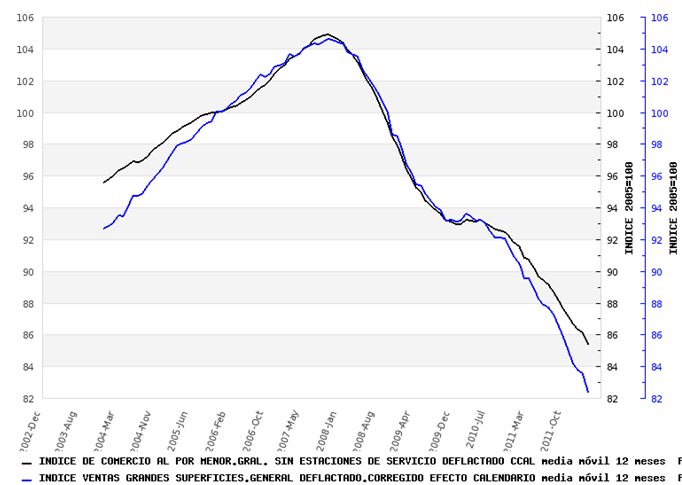 Los servicios no sufren mejor suerte, y tanto el índice de comercio minorista (ICM) como el de grandes superficies (especialmente este último) padecen su peor caída de la historia en el mes de abril (últimos datos publicados). Los descensos en ambos casos superan ampliamente el 20% desde máximos (21% en el caso del ICM y 24% para las grandes superficies).