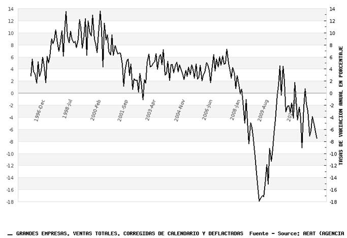 - Las ventas de grandes empresas. Siempre fue, hasta que comenzó la crisis, el indicador que mejor correlacionaba con el PIB (0,89). Caen en abril a una tasa de 7,51%, el segundo peor descenso desde 2009. Si pensáramos que el PIB sigue correlacionando con este indicador, estaría descendiendo, en lo que va de año, a tasas cercanas al 6%. Como dato alarmante está la caída en las exportaciones de estas grandes empresas, que llega (a precios constantes) al -1,54%, encadenando el tercer mes consecutivo de contracción.