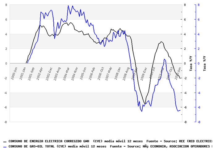 - El consumo de electricidad encadena su undécimo mes en negativo, mientras que el de gasóleos cae como en los peores momentos de 2008-2009 y se mantiene en negativo desde hace 14 meses.