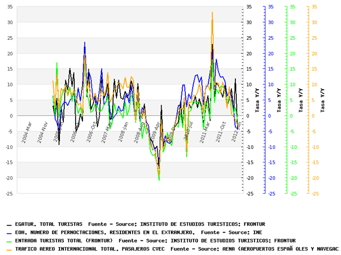 - El turismo entra en negativo en todos sus componentes: entrada de turistas, gasto, tráfico aéreo internacional y pernoctaciones, después de estar en positivo de forma casi ininterrumpida desde hace dos años.