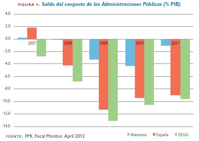 Desde 2007 hasta 2009, España y EEUU deterioraron su saldo público en 13,1 y 10,3 puntos porcentuales del PIB, respectivamente. Mientras, Alemania sólo lo hizo en 3,4 puntos. Desde entonces, la consolidación fiscal apenas ha conseguido mejorar este descuadre en 2,3 puntos porcentuales en el caso de España y 3,5 en el de EEUU. Como resultado, ambos países cerraron 2011 con un déficit público muy abultado.