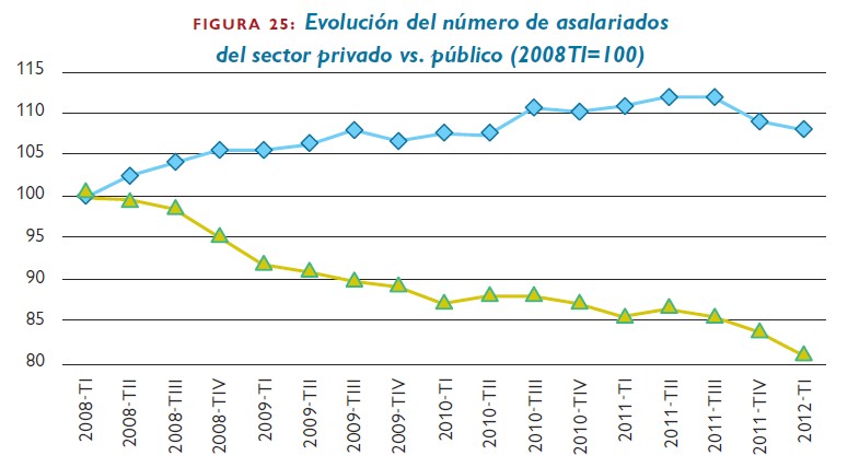 - En España, los planes de estímulo de la demanda por la vía de la política fiscal no consiguieron en 2008-2009 evitar la sangría laboral. "Lo que sí consiguieron fue mantener la expansión del número de empleados públicos, que solo se ha empezado a reducir a finales de 2011". El sector público aumentó el número de asalariados en 230.000 personas desde el inicio de la crisis, mientras que el privado lo redujo en más de 2.600.000 personas (la línea azul representa la evolución en términos porcentuales de los empleados públicos y la amarilla de empleados del sector privado).