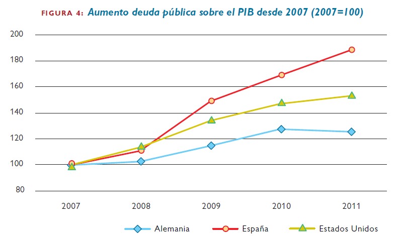 Como resultado de estos abultados déficits, la deuda pública de España en 2011 es un 90% superior a la de 2007; en EEUU ha aumentado un 50% en el mismo período; mientras que en EEUU tan sólo ha crecido un 25%. Es decir, en términos de crecimiento de la deuda pública, "España es líder indiscutible".