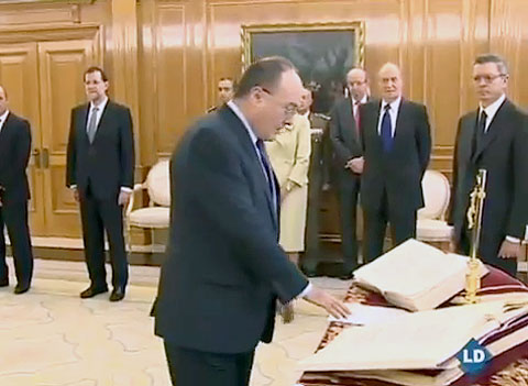 Los primeros en entrar en la sala han sido De Guindos y Rajoy, que han dado los buenos días a los periodistas presentes, al igual que el ministro de Justicia, Alberto Ruiz-Gallardón, quien ha acudido en su calidad de notario mayor del Reino.