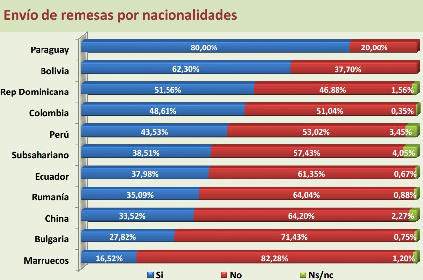 En cambio, los colectivos extranjeros que tienen más empleo que los españoles son los paraguayos, cuya tasa de empleo es el 87%, y los chinos. Los chinos, además, son los extranjeros que menos remesas envían a sus países de origen. El 33% envía dinero a su país de origen una vez al mes.